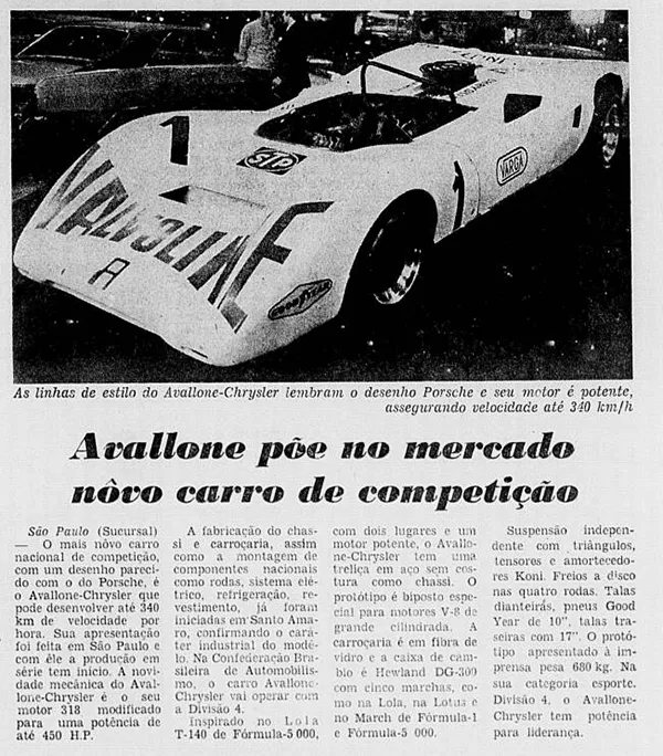 O cinema brasileiro da década de 1970 produziu algumas curiosidades automotivas memoráveis. Uma delas aparece no filme Roberto Carlos a 300 Quilômetros por Hora (1971), estrelado por Roberto Carlos. No longa, um protótipo de corrida chamado Avallone Chrysler, frequentemente grafado como Avalone, torna-se o grande protagonista das cenas de corrida e um dos carros mais curiosos já vistos no cinema nacional.